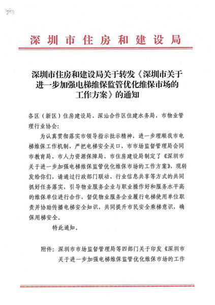 深圳市住房和建設(shè)局關(guān)于轉(zhuǎn)發(fā)《深圳市關(guān)于進(jìn)一步加強(qiáng)電梯維保監(jiān)管優(yōu)化維保市場(chǎng)的工作方案》的通知
