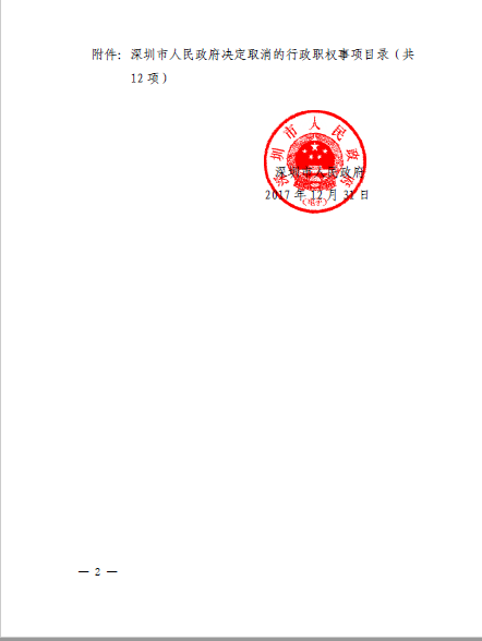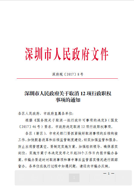 深圳市人民政府關(guān)于取消12項(xiàng)行政職權(quán)事項(xiàng)的通知(深府規(guī)[2017]8號)